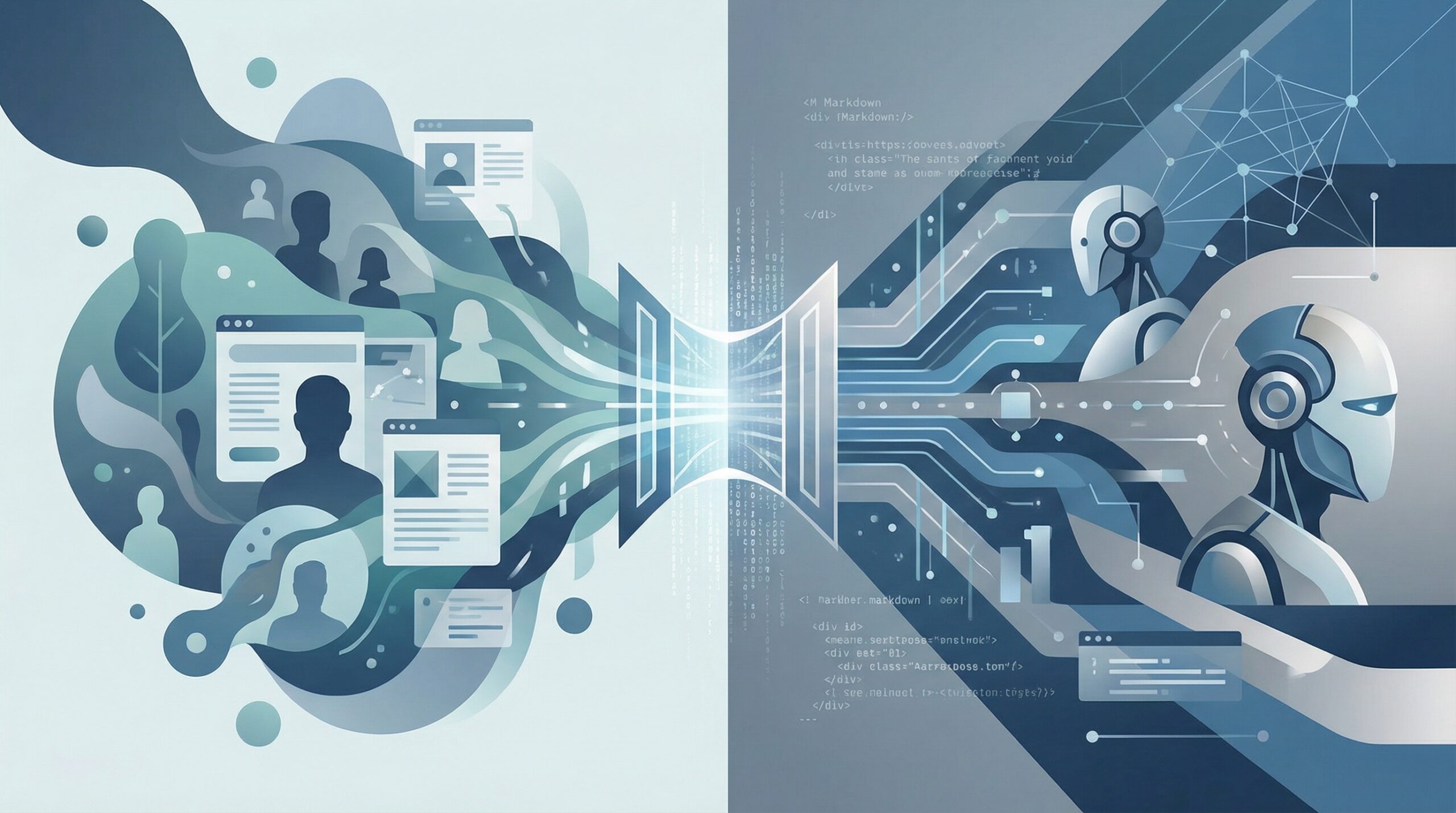 私たちが普段ブラウザで見ているウェブサイトは、HTML、CSS、JavaScriptによって構成され、人間が視覚的に理解しやすいようにデザインされています。しかし、大規模言語モデル(LLM)やAIエージェントにとって、これらの情報は必ずしも最適ではありません。AIが必要とするのは、デザイン要素ではなく「テキスト情報」と「論理構造」だからです。